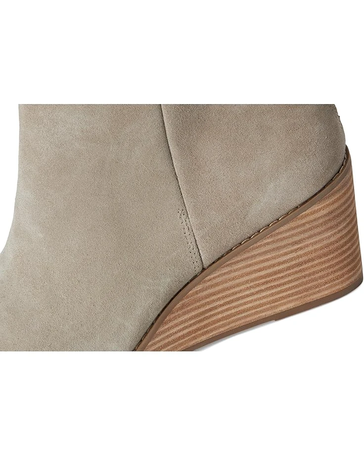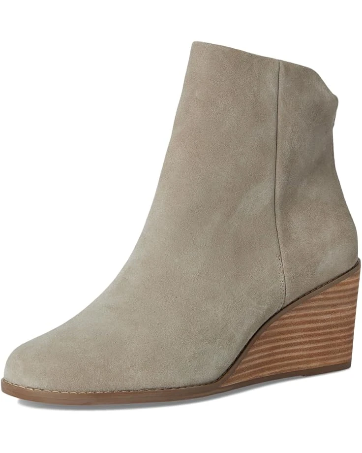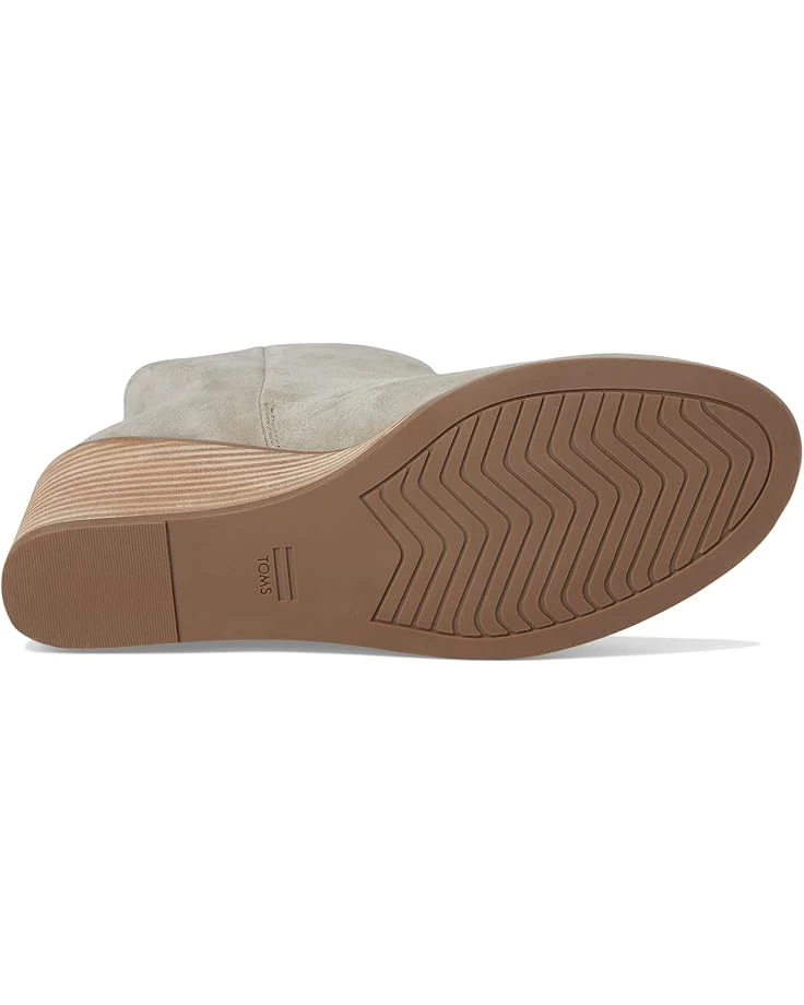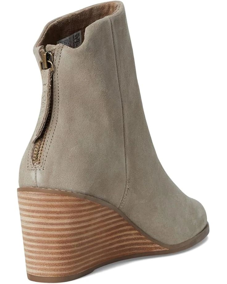 - The TOMS® Casey is a minimalist wedge boot with back zipper closure and stacked leather-wrapped heel offering a refined flair. With a round toe design, the footwear features leather upper construction and ankle-high silhouette.