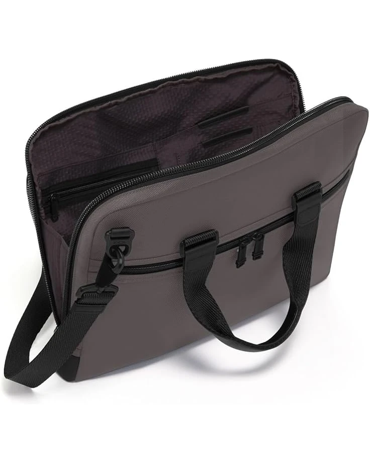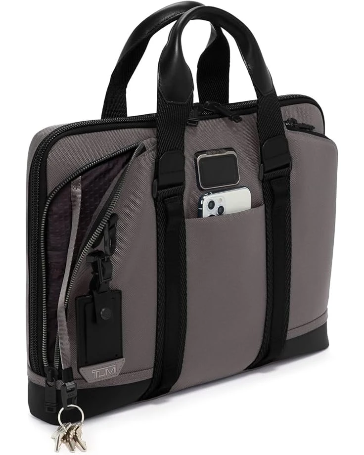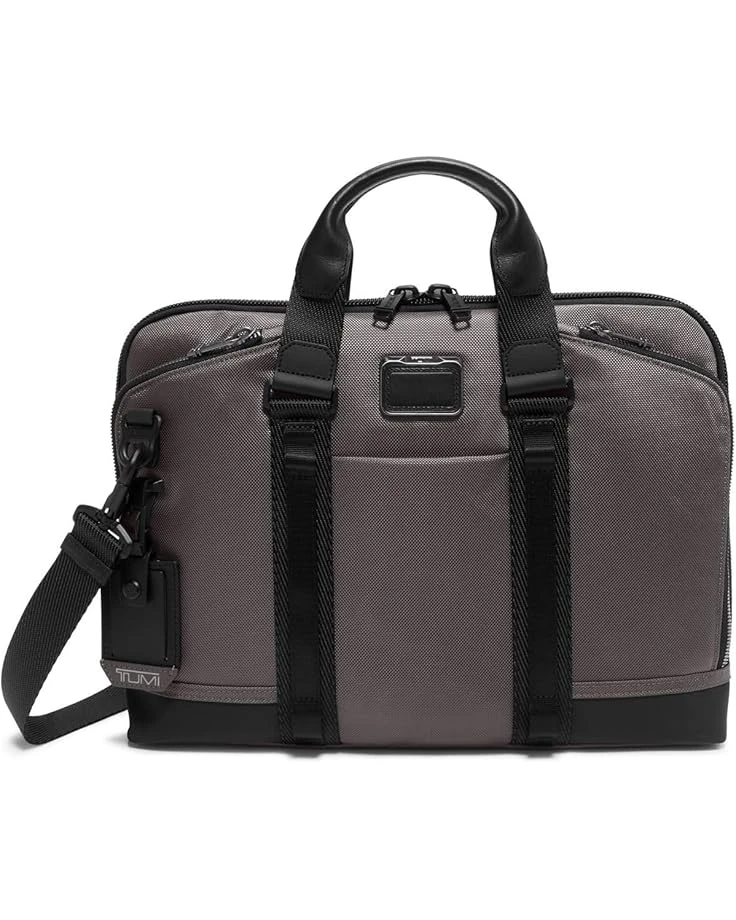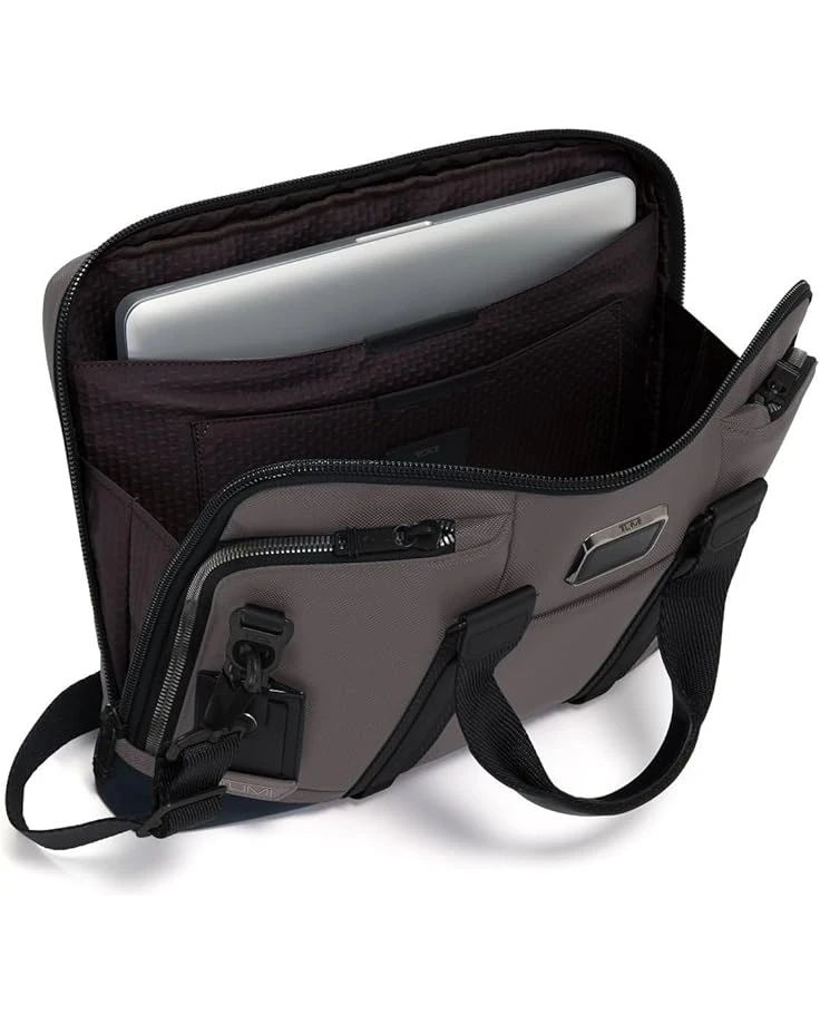 - Indulge in the finer things with the Tumi® Academy Brief. Crafted from leather, this slim and well-organized briefcase features zippered top closure, top carry handles with leather accent, detachable/adjustable shoulder strap, two front zippered pockets, one quick access pocket with magnetic snap closure. This bag has one padded tablet pocket, one padded laptop compartment that fits up to a 15“ PC or 16” MacBook screen, key leash, TUMI Tracer® and pen holders.