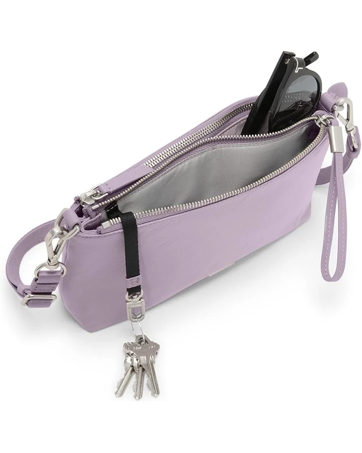- Compact and feature-packed, the Tumi® Adela Crossbody features two separate compartments to keep you organized, including microfiber-lined and wipeable pockets that protect valuables and cosmetics alike. The magnetic snap closure of the purse keeps your stuff secure. Made from nylon and leather, this crossbody purse comes with a removable and adjustable crossbody strap that makes it easy to carry around. This stylish crossbody purse features microfiber lining in the center pocket and wipeable lining in the zippered back pocket.