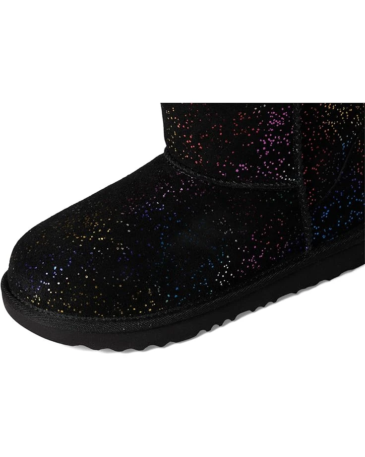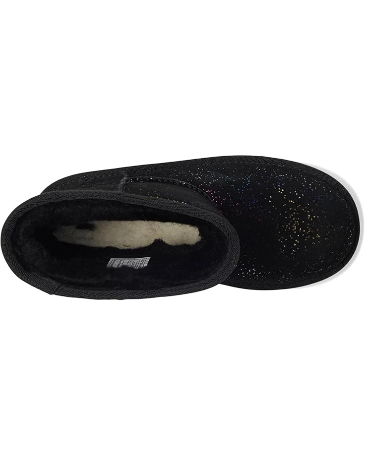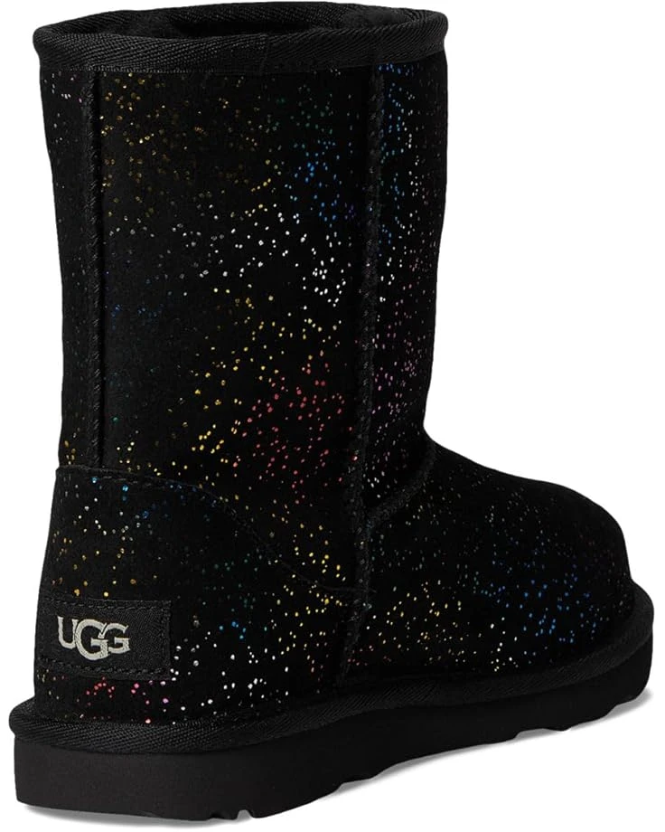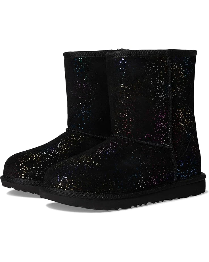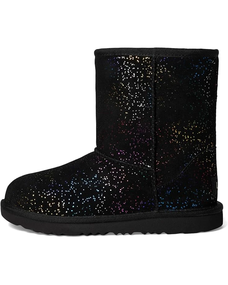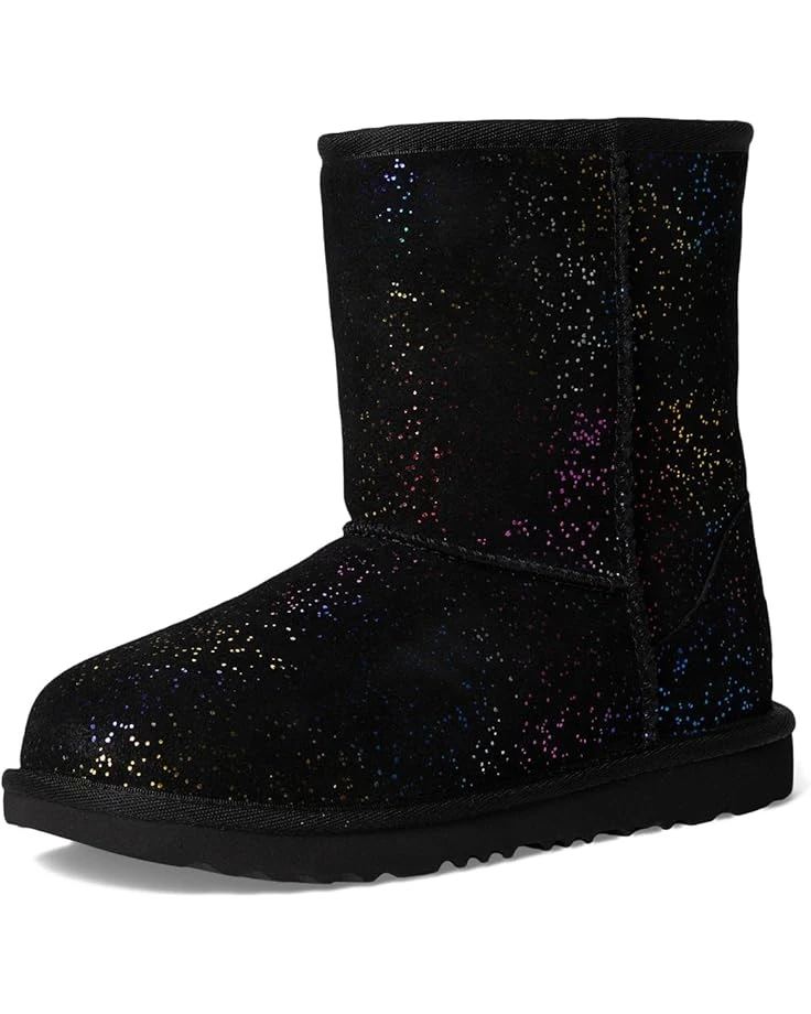- With a glittery finish and a durable sole, the UGG® Kids Classic II II Shimmer Sky is perfect for little ones who love to shine. Easy to slip on and off, they’re built for comfort and designed to stand out, whether on the playground or at a party. Featuring round toe, ankle-high silhouette, soft suede upper and UGGplush™ interior, plus just the right amount of sparkle.