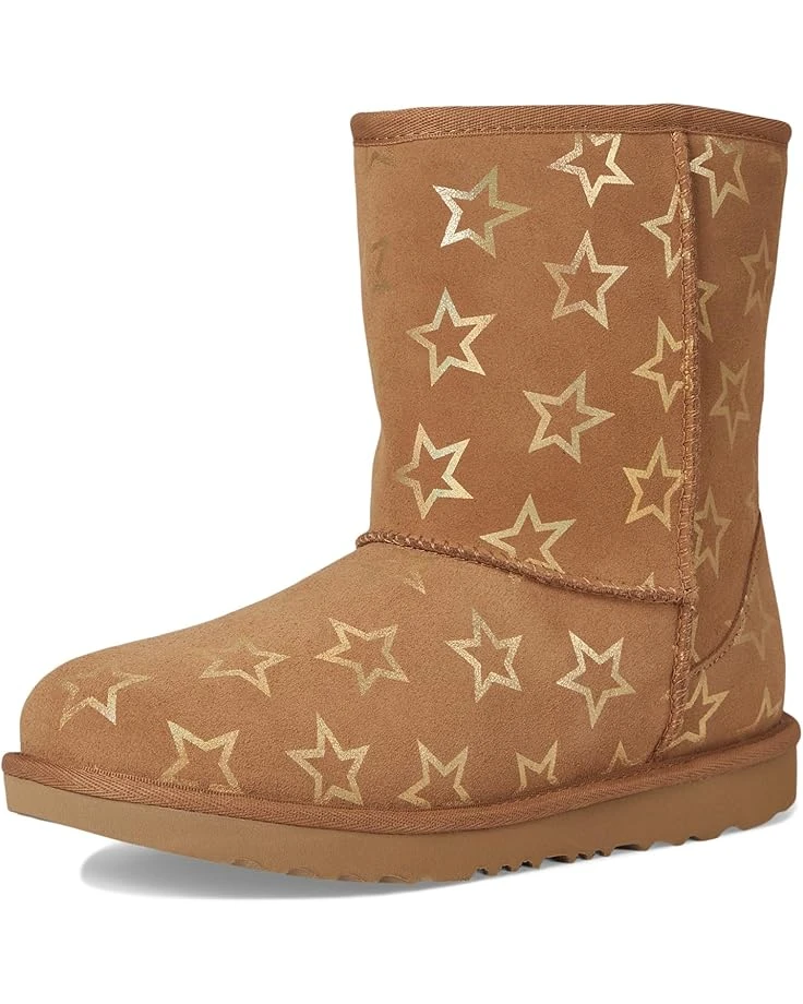 - Keep tiny feet warm and dry with the pull-on style UGG® Kids Classic II Iridescent Stars boots that offer unmatched comfort and playful designs. Crafted from soft suede upper and UGGplush™ interior, plus an upgraded pattern that will have them reaching for the stars. Featuring ankle length silhouette, round toe, and foam footbed.