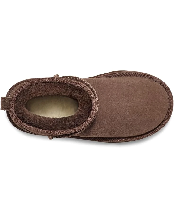 - Embodying a lightweight, cozy, and versatile design, the UGG® Kids Classic Ultra Mini Boots are something that your younger one would love to wear during those brisk weather conditions. Perfect for all-day play, the boots are made with a 17 mm twinface sheepskin upper, a 17 mm sheepskin wool lining, and a 17 mm UGGplush™ 60% upcycled wool, 40% TENCEL™ Lyocell insole or 80% upcycled wool, 20% TENCEL™ Lyocell insole. The overlock stitch detailing on seams enhance the durability of these shoes while the rear pull tab gives your kid an easy, pull-on fit.